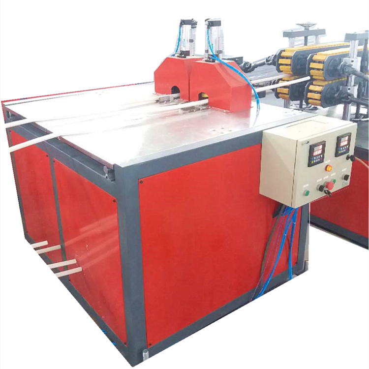 The PVC raw materials are preheated and mixed by the 300/600 mixing unit, then enter the SJSZ-65/132 conical twin-screw extruder for melting, plasticizing and extrusion. They are formed into tube blanks through the double-tube mold, and then enter the SZD-4000 double-tube vacuum sizing water tank for cooling and shaping. After that, they are uniformly pulled by the double-tube traction machine and automatically cut to the set length by the cutting machine. Finally, the collection is completed through the double-pipe discharge platform.